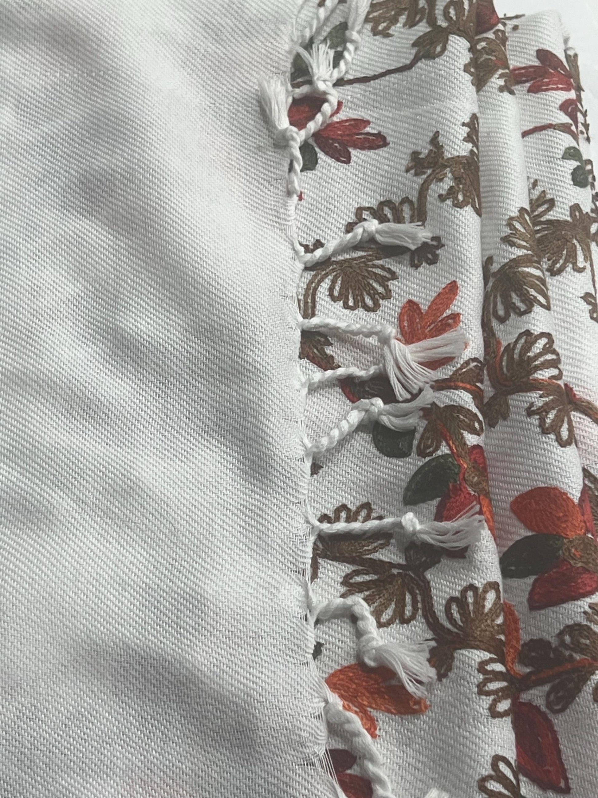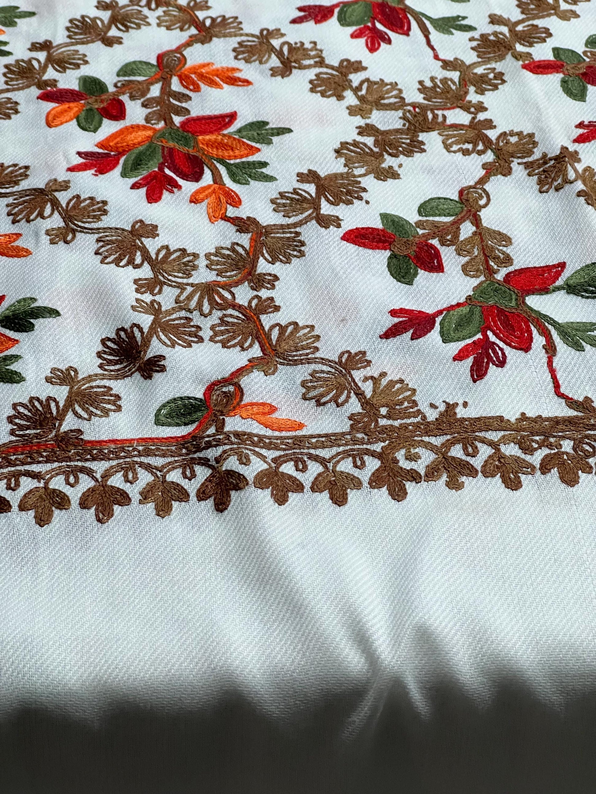 Cashmere Pashmina Shawl: Long White & Orange Leaf Pattern